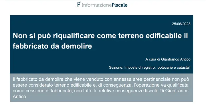 Il fabbricato da demolire che viene venduto con annessa area pertinenziale non può essere considerato terreno edificabile e, di conseguenza, l’operazione va qualificata come cessione di fabbricato, con tutte le relative conseguenze fiscali. Di Gianfranco Antico